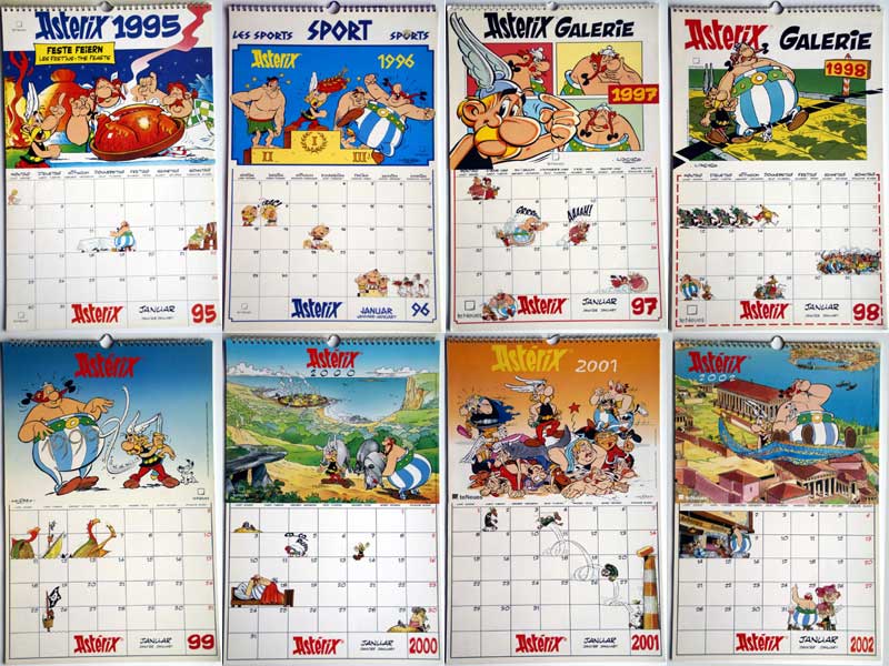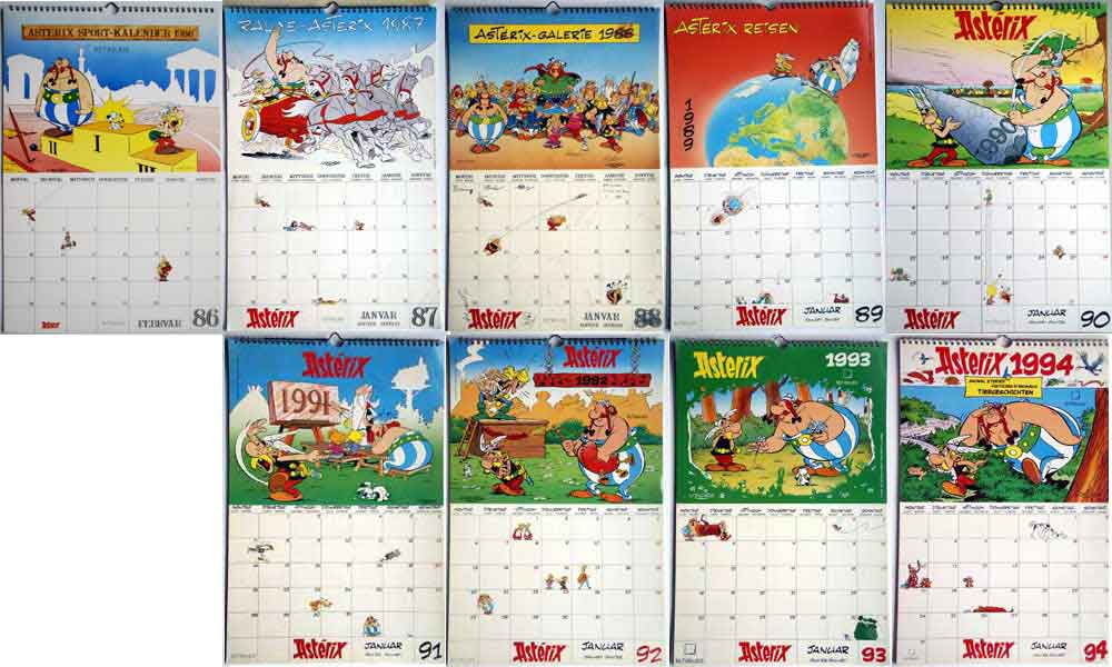 Für die Jahre 1986 bis 2002 (Motive 1986-1994 / Motive 1995-2002) erschienen in der teNeues Verlagsgruppe jeweils jährlich ein Wandkalender im Format 31 cm x 49,5 cm. Die oben spiralgebundenen Kalender teilen sich in in zwei Hälften auf. In der oberen Hälfte eines Blattes findet sich ein Motiv aus einem Asterix-Abenteuer mit zum Teil abweichendem Hintergrund (abgebildet der Kalender 2002 mit einem Motiv aus "Asterix im Morgenland") und in der unteren Hälfte ein geräumiges Kalendarium, das seinerseits mit Asterix-Figuren und Szenen illustriert ist.
