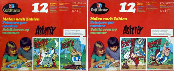 Die Firma "Milton Bradley GmbH", im deutschsprachigen Raum auch bekannt unter dem Namen "MB-Spiele", veröffentlichte 1977 in ihrer Serie "Malen nach Zahlen" zwei Sets für Kinder zwischen 6 und 14 Jahren, in denen jeweils zwei Asterix-Motivvorlagen mit Wasserfarben ausgemalt werden konnten (Abbildungen). In jedem Set sind neben den beiden 279 x 228 mm großen Bildern zum Ausmalen auch die nummerierte Farbpalette und Pinsel enthalten. Rechts die abgebildete Vorder- und Rückseite eines Sets.