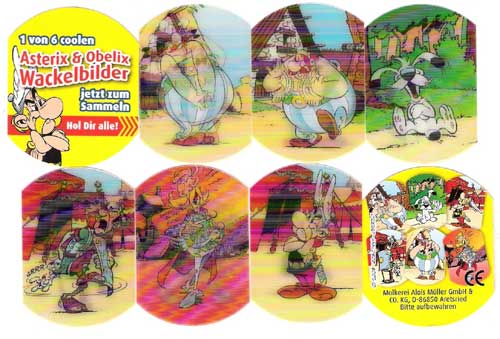 Für etwas mehr als einen Monat klebte ab Mitte Juli auf jeder Viererpackung Doppel Decker zusätzlich eins von sechs Wackelbildern mit Asterix-Motiv (Asterix, Obelix (2x), Idefix, Troubadix, Legionär, (Motivübersicht)). Beispielhaft sind rechts jeweils die beiden Motive der Wackelbilder von Troubadix, Obelix und Idefix abgebildet. Neben diesen Wackelbildern sind noch weitere bei anderen Herstellern erschienen, die über die Comedix-Suche aufgelistet werden. Die beiden Bilder rechts aussen stammen vom Hersteller.