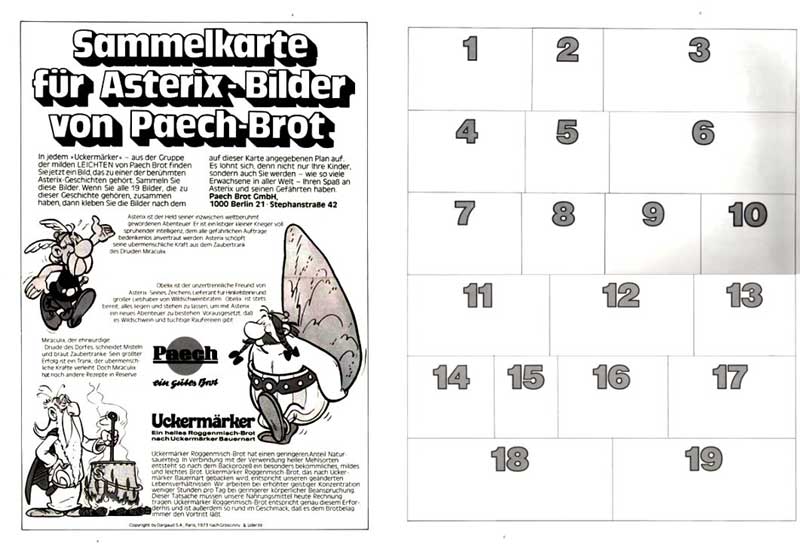 In den Jahren 1973 und 1974 sind zwei Serien von der Firma PAECH-Brot aus Berlin erschienen. Die erste Serie bestand aus 19 Bildern, die auf eine Sammelkarte im Format DIN-A-3 geklebt werden konnten. Die Rückseite dieser Serie war mit der entsprechenden Bildnummer gekennzeichnet (Beispielmotive). Da es von dieser Serie zwei leicht unterschiedliche Texte auf der Rückseite gibt, ist anzunehmen, daß es mindestens zwei verschiedene Auflagen gab.