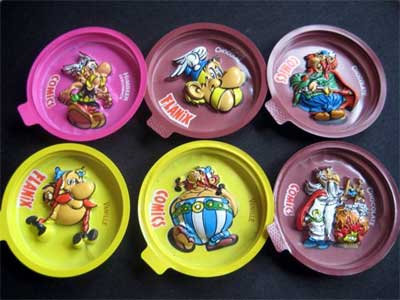 1993 wurden in verschiedenen Supermärkten Vanille- und Schokopudding des Herstellers Schwälbchen mit Tiefzugdeckeln zum Thema Asterix unter der Marks "comics" verkauft. Die Deckel der Produkte "Chocolate Comics Dessert", "Vanille Comics Dessert" und "Wackel Comics Götterspeise" können bspw. mit Gips ausgegossen und die Abdrücke bemalt werden (Beispielabdruck). Schon 1992 gab es Tiefzugdeckel mit dem Aufdruck Flanix, die vom Schweizer Hersteller MIGROS vertrieben wurden.