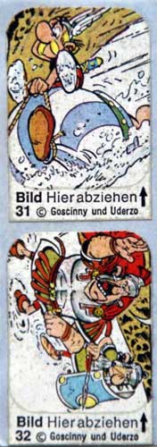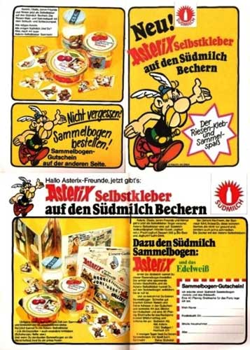1974 erschien bei Südmilch eine Sammelserie "Asterix und das Edelweiß" mit einem passenden Sammelbilderbogen (Bildbeispiele). Die Serie ist ein Auszug aus dem Album "Asterix bei den Schweizern", bei dem einige Figuren "ausgeschnitten" sind, so dass die Szenen mit den Sammelbildern zu vervollständigen sind. Der Bogen, der für 40 Pfenning zu erwerben war, ist ein Faltbogen und zusammengefaltet 13,5 x 15,2 cm groß. Er ist insgsamt 7x gefaltet und hat ausgeklappt somit 16 Seiten von denen 1 Seite Titel, 1 Seite Vorwort und 14 Seiten Bildergeschichte sind.