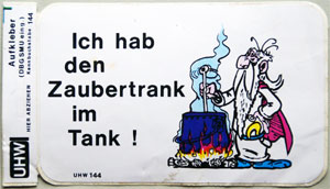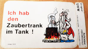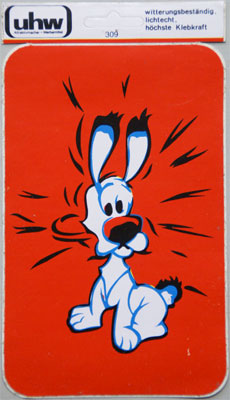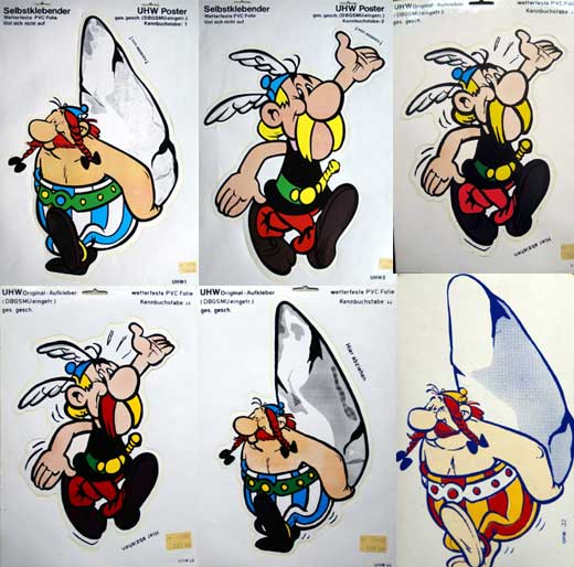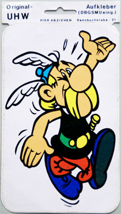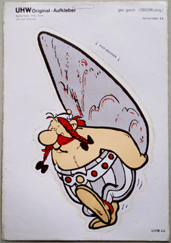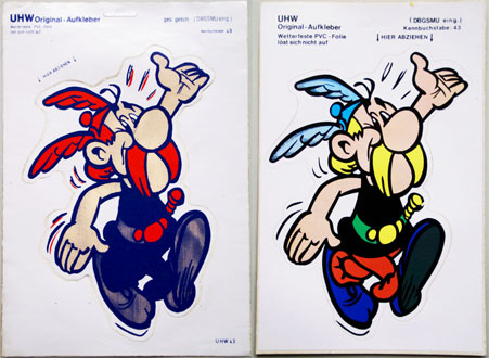 Sehr wahrscheinlich in den 1970er Jahren erschienen bei der Firma "UHW Siebdruck" verschiedene wetterfeste Aufkleber aus PVC mit Motiven aus frühen Asterix-Abenteuern. Die Aufkleber tragen verschiedene Kennungen und wurden in unterschiedlichen Formaten im Handel verkauft. Da es verschiedene Farbvarianten gibt ist es wahrscheinlich, dass die Aufkleber nicht zum gleichen Zeitpunkt verkauft wurden.