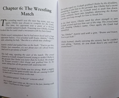 Und die sonstigen vollmundigen Versprechen? Naja. Das Büchlein hat ein Inhaltsverzeichnis, das 10 Kapitel ausweist: "The Invitation", "The Journey to Greece", "The Olympic Village", "The Archery Contest", "The Chariot Race", "The Wrestling Match", "The Secret of the Gold Laurel", "The Final Showdown", "The Triumph of the Gauls" und "The Return to the Village". Die meisten Kaiptel haben zwei Seiten, die nicht immer ganz mit Text gefüllt sind, eines hat drei Seiten und das letzte fünf Seiten. Eine ordentliche und übersichtliche Gliederung der Geschichte ist es aber.
